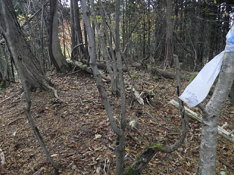 最初の1050mピークには幅広のテープが木に巻き付けてあり、その隅に1050mと記入されていました。 |