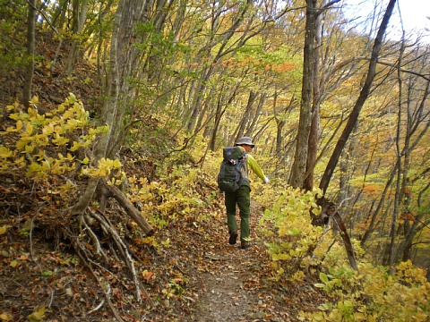 | 谷あいを見下ろすと・・あら綺麗だ事。 | 登山道も黄色ですよ。以下紅葉の様子をご覧あれ。 |
