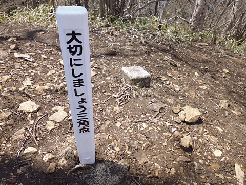 | 誰も居ない山頂。思ったより山名板が少ない。 | 三角点峰です。 |