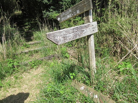 | 廃道となって久しいと思われるが、昔の通行されていた時代の標識が。 | 枝が伸びていて歩きにくいことこの上なし。 |