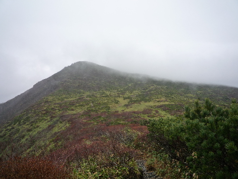 | これから向かう三本槍岳の頂上も見えたではありませんか。 少しだけガスが晴れることを期待しましょ。 |