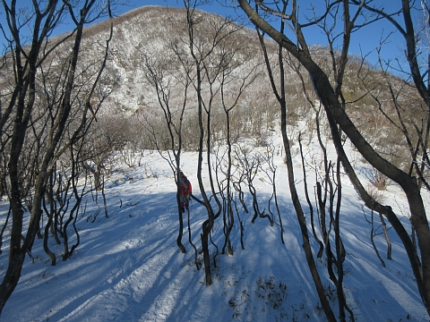 | 後ろを振り返って黒檜。雪は多くも無く少なくも無く。 | 大タルミから駒ヶ岳への最後の登り。 |