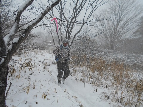 | 雪の下は落ち葉で滑りやすい。傾斜があるのでロープがありがたい。 | なだらかになった。あれ、吹雪かれて前不動を見損ねてしまった。 |