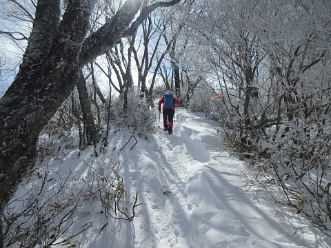 ちなみに大沼のワカサギ釣りのテントは見受けられなかったのですが、平日だからでしょうかね。 ちなみに長七郎頂上から降りてすぐの平地で休憩中のベテラン登山者と遭遇。 実は地図を忘れてしまいまして・・・等と言っていると「小滝へは地図なんて役に立たないよ。自分のトレースがあるから辿っていけばよいよ」と親切に教えていただきました。 この時期長七郎近辺でウロウロしている人はかなり高い確率で小滝の氷瀑見物なのでしょうな。 |