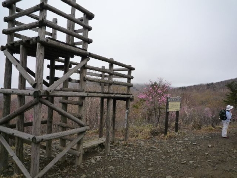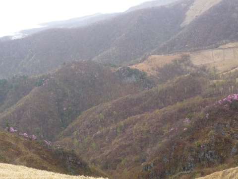 | 笹原の尾根道まで戻るとうまい具合に霧が晴れていたので、遠望の両尾根のアカヤシオが咲いている風景をと。