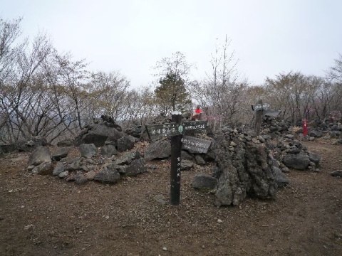 小丸山頂上です。 後ろの人は退去が間に合わなかった様です。 背景はごらんの通り。 何にも見えません。 本来ならばここも眺望が望めるはずなのですが残念です。 |