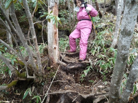 登山口へと向かう最後の下りの雑木林です。 霧が一段と濃くなりました。 おまけに足下が滑りやすく、何度も尻餅をつきそうになりました。 |