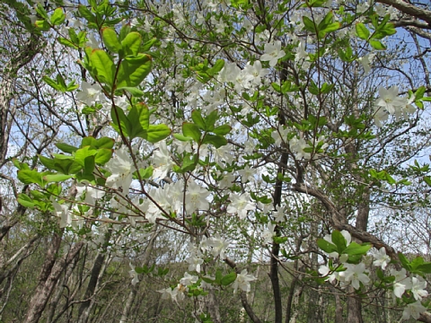 | 折場登山口は当然のことながら満杯。かなり手前の路肩から駐車車両が。結局折場登山口を過ぎて結構下った路肩スペースに駐車。 | 駐車位置から登山口まで登り返して登山開始となる。 最初に出迎えてくれたのが東国ミツバツツジ。 |