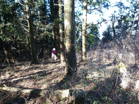 | でんべい山を目指す途中で泉龍院の屋根が見えたので右方向の斜面を下る事にした。踏み跡は無いが藪ではない。 | すぐに踏み跡に出て人家のある場所へ降り立った。 後は車道を歩き駐車場まではすぐの距離である。 |