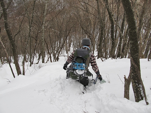 | そのうちに破線道に合流。指導標がありました。 | この先は傾斜も緩んだのでお二人はスノーシュー。ハイトスはワカン。 |