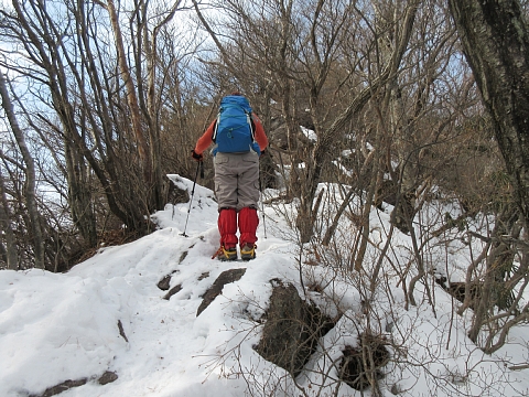| 南向きの斜面は一部雪が溶けており歩きづらい。 | これくらいしっかりと雪と氷があるほうがアイゼンの効用大である。 |