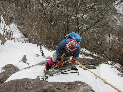 | 鈴の姿を木々の隙間から見てから少し降って大ダオへ。 | 鈴への登りで所々雪の付着の無い露岩がアイゼンではつらい。 |