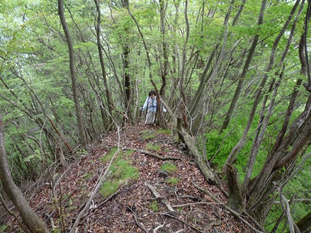 | この痩尾根は傾斜は急だが、木の根がしっかりしており登りやすい。