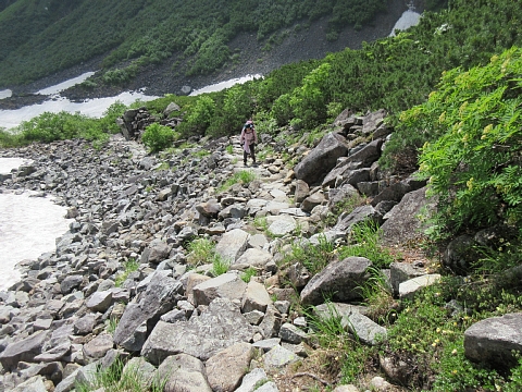 | 雪渓歩きと岩場歩きを交互に。 | 中々近くになりませんね。アルプスでは里山の法則は成り立たず。 |