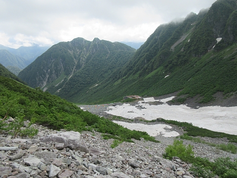 | 今日は晴天。今日登れば良かったと思うけれど疲れ切っていて無事に上高地までたどり着くことを考えるだけで精一杯。 | 下りは早いねぇ。もうこんなに降りちゃいましたよ。 頭の片隅に涸沢岳へとの思いもあったけれどあっさり断念。 |